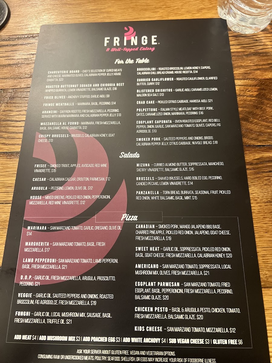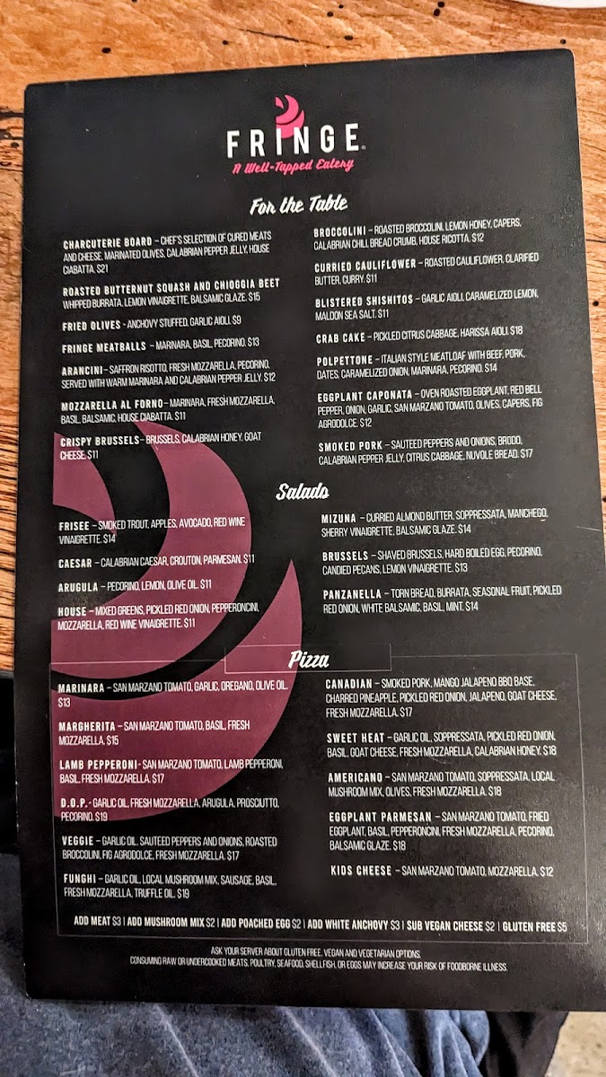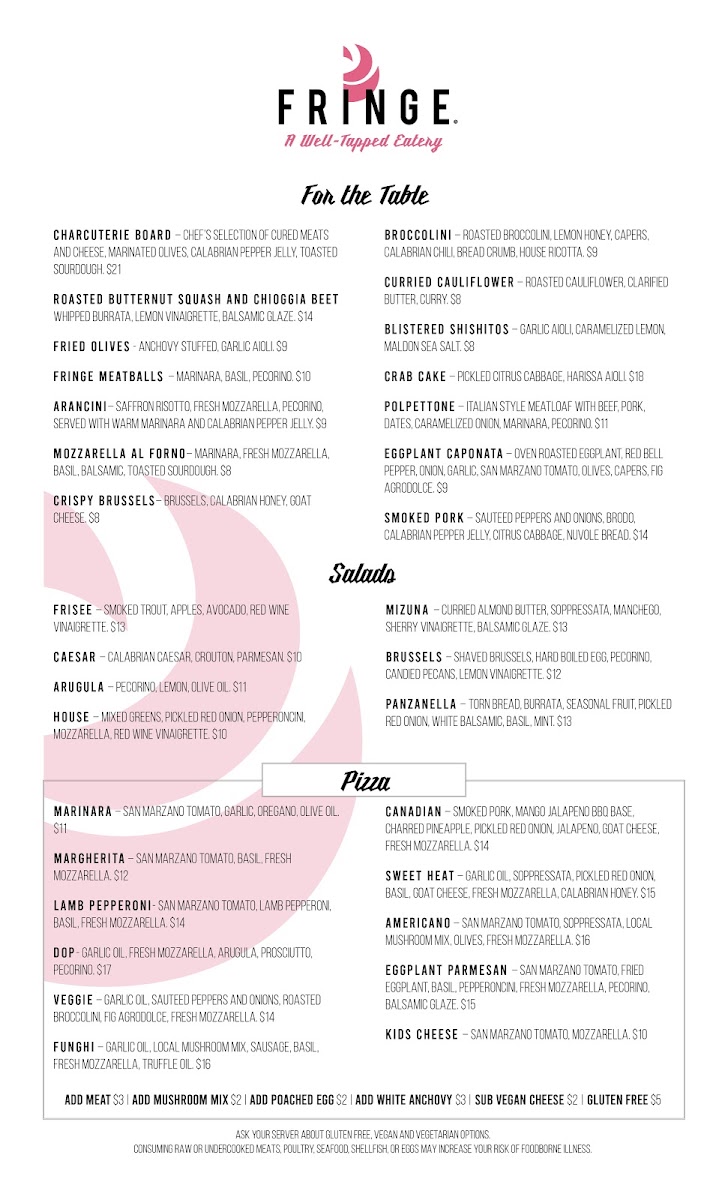 Welcome to Fringe - A Well-Tapped Eatery, a culinary gem nestled in Boulder, CO. This vibrant eatery captivates diners with its innovative pizza offerings and delectable small plates. Each creation bursts with flavor, highlighted by dishes like the Americano Pizza with soppressata and fresh mozzarella or the rich Eggplant Parmesan Pizza, artfully layered with balsamic glaze.